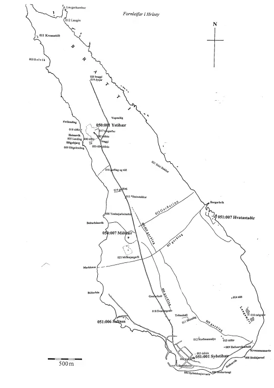 Voru 45 staðir skráðir í Hrísey, þar af 26 í landi Ystabæjar og 19 í landi Syðstabæjar. Aðeins tveir minjastaðir eru í hinni fornu landareign Miðbæjar, en bæjarstæðið þar telst allt einn minjastaður. Þá er einnig ljóst að minjastöðum mun fjölga mjög í landi Syðstabæjar ef fornleifar sem tengjast myndun þorpsins verða skráðar.