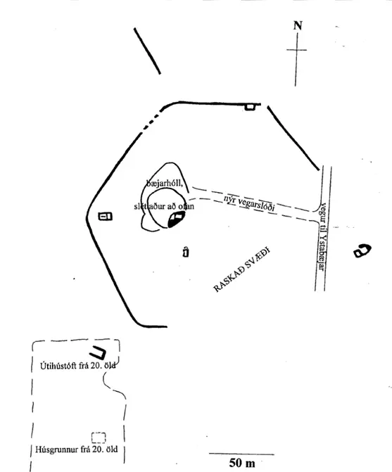 Niðri í lægðinni milli þessa hóls og bæjarhólsins er ávöl bunga upp úr deiglendinu sem þar er og gætu þar verið mannvirkjaleifar.