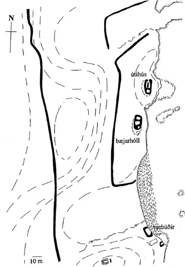 tóftarinnar, hún er eingöngu úr torfi en járnið hefur verið fjarlægt. Ójöfnur eru í kring um þessa tóft, bæði austan og vestan við hana, sem gætu verið mannvirkjaleifar.